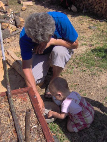 Tatával szedegetjük a forgácsokat…