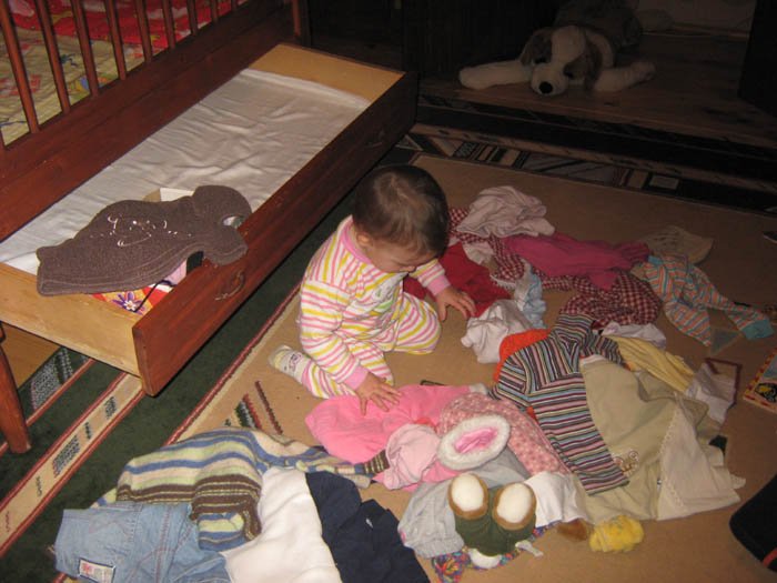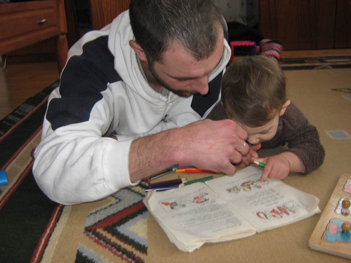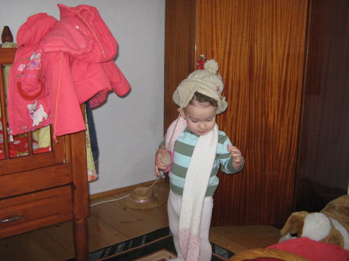 Mindennap meglepetésként ér, hogy mennyire okos,(tudom, elfogult anya vagyok…) ma számoltam össze, az aktív szókincse kb. 60 szóból áll, de szinte mindent ért, olyan dolgokat is, amiről szinte kizártnak tartjuk. Ha pedig valami elmélyült magyarázásba kezdek(szoktam…), akkor utánoz: gesztikulál és mondikál jó hangosan:) Kedvenc elfoglaltsága most is az olvasás, reggelente hosszasan “telefonál”, egyre többet játszik a kockáival, és az állatos kirakókkal, habár már kívülről tudja mindegyik figura helyét. Anyuméknál a römi a legújabb kedvenc, azt kiborítja, rakosgatja fel a táblára, a két zsoli mindig puszilózik:) A babák iránt még mindig nem mutat érdeklődést, a kedvenc nyusziját néha puszilgatja, a plüssállatok kávét isznak(vagy bort:))