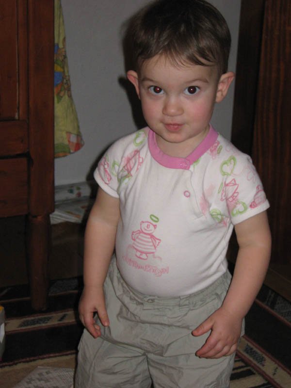 Evés terén semmi sem változott, néhány napja picit kevesebbet eszik, de gondolom, ez a fogzás miatt van. Valójában a reggeli és a délelőtti adag csökkent, de estére bepótolja:) A joghurtot még mindig utálja, újabban a palacsintát sem kéri, esetleg néhány falatot. Vajas kenyér, sonkás felvágott, savanyú uborka bármilyen mennyiségben jöhet, na és mazsola. Sokat harcolok a nagyikkal, dédiékkel a csokifogyasztást illetően, ők adnak néha, de itthon soha nem kap csokit, cukros üdítőt meg ilyeneket. Ma a tejbegrízet határozottan elutasította(igaz, soha nem szerette igazán), és amikor kérdeztük, mit szeretne reggelizni, rávágta: ételt…