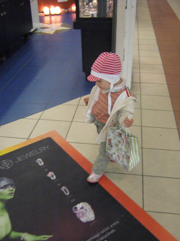 A bevásárlóközpontok sokszínűsége őt is magával ragadta. Még szerencse, hogy nem járunk sokat ilyen helyre, teljesen “megvadult”, rohangált, sikított, és persze, amikor betettük a kocsiba, volt nagy sírás, hiszti…