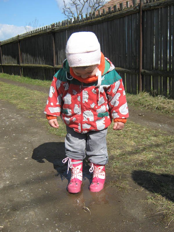 Mostanáig, ha belementem a sárba, pocsolyába, Anya és Apa kicsit mérgesek voltak, de most! Csak nevettek amikor tapicskoltam az egyetlen pocsolyában az udvaron, nevettek és biztattak, hogy csak nyugodtan. Olyan furcsák a felnőttek, nem tudják, hogy sarat dagasztani milyen jó dolog. Persze, nekik nincs ilyen szuper gumicsizmájuk, mint nekem!