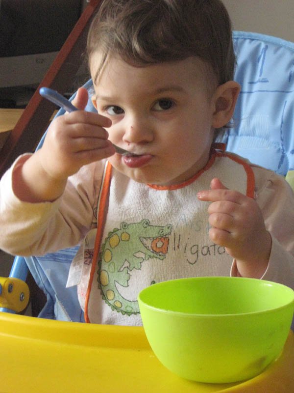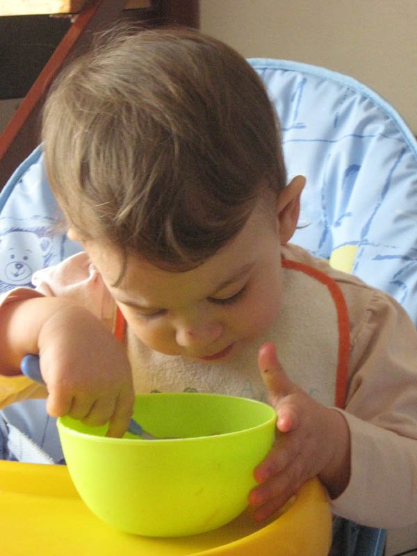 De a tej nemivása csak egyik az evési szeszélyek közül. A reggeli legtöbbször szintén nem kell, vagy ilyen extrém kombinációkban, mint amit fent említettem… A joghurt kedvenc lett, pedig soha nem szerette, házikolbászból akármennyi jöhet, de szigorúan kenyér nélkül. Csirkehús nem kell, helyette jöhet két tányér leves, de csak ha murok is van benne. Sajtos pogácsából extrém mennyiségek, kivi nem kell, mert “vizes”, a kenyérnek csak a karéja. Savanyú uborka, gogos második helyett, palacsinta csak villával, tányérból, egyedül… Alma héjastól, épen, banán csak akkor ha én adom, mert ragad és akkor rögtön törölni kell a kezét, különben hiszti van… Talán a vajas kenyér és a mazsola tartják még a régi helyüket, de ki tudja meddig….