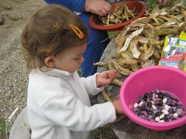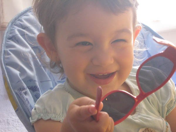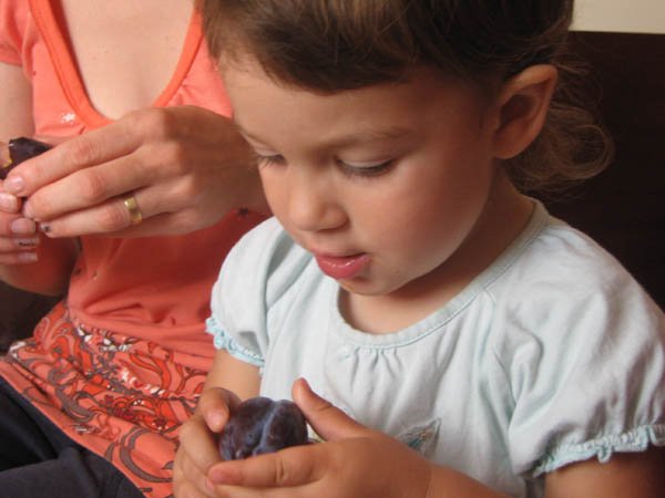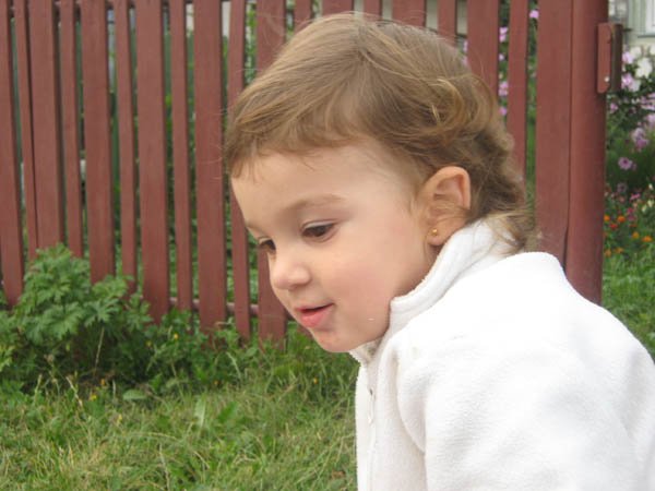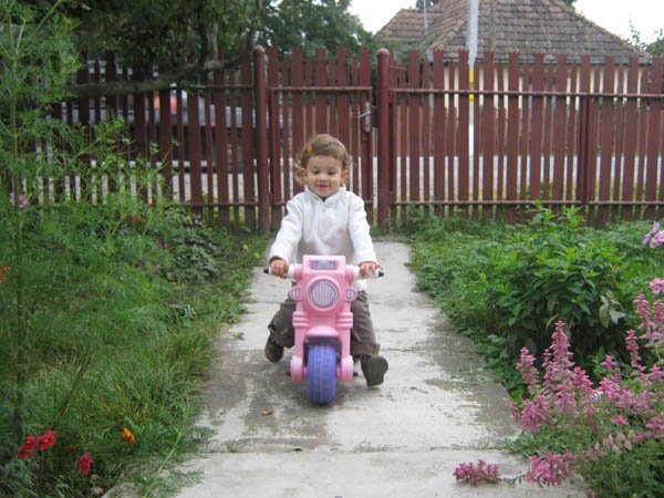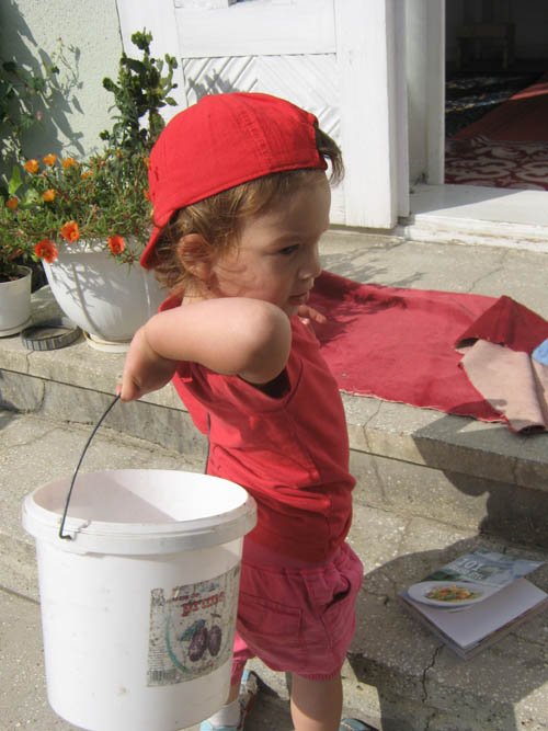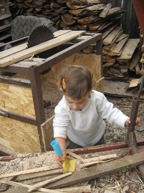 Nincs babázás, a babák sorsa nagyon mostoha nálunk. Hetente egyszer megpuszilgatja őket, aztán földhöz vágja. Annál jobban szereti az autókat, ezekből van ezerféle: amelyikre rá lehet ülni, van hátrahúzós, van piros motor is, meg dudálós autó, milkás kamion, busz, forma 1-es…. Imád építőkockázni, kirakózni, főzni velem a konyhában, paszulyt szemezni, fát rakni rakásba, mosztot lapátolni, vizet vinni az állatoknak, különböző hosszúságú botokkal rohangálni az udvaron, kavicsot gyűjteni, motorozni, “vezetni” az Opelt, sepregetni, egy ronggyal mindent letörölni, a cipőimet sorra próbálgatni(na de az Apáét is!) lépcsőt mászni, tatával a pincében megszámolni a boros korsókat, Levivel számítógépezni, Dédinél varrni a varrógéppel, virágot szedni, paradicsomot szedni és rögtön megenni, a homokban fetrengeni órákig. Ezek után elképzelhető, hogy néz ki estére. Szóval nincs szükség fehér lakkcipőre, lakkozott körmökre. Mert igazi gyerek.