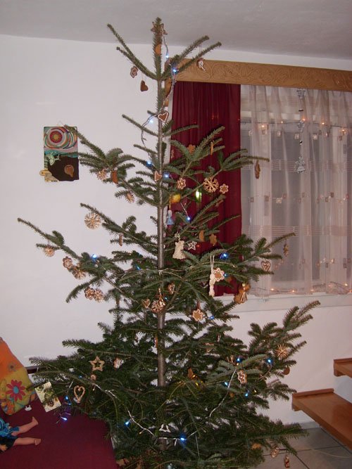 Ilyen lett a karácsonyfánk, éjszaka kettőkor, ahogy felraktuk a mézeseket és a szalmadíszeket, egymásra néztünk, és szinte egyszerre mondtuk: a gömbök idén a dobozban maradnak. A szaloncukor pedig a fa alatt. Nagyon egyszerű lett, de szerintem nagyon-nagyon szép:)