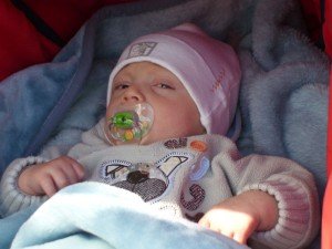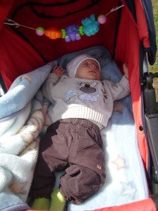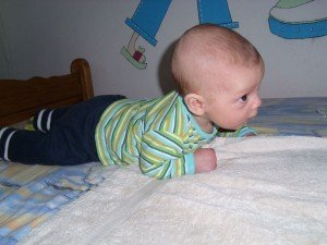 Eltelt három hónap a születése óta, ha nem is észrevétlenül, de elég hamar ahhoz, hogy csak kapkodjam a fejem, már nem egy picibabánk van, hanem egy izgő-mozgó sajtkukac, aki hamarosan uralni fogja az egész lakást… A mozgásfejlődése sokkal hamarabb elindult, mint Sarolté, nem a hasonlítgatás miatt, de annyira hamar történnek a dolgok, hogy el sem hiszem. Két hete már annak, hogy hasról visszafordult a hátára, a hasáról oldalra fordul – mondjuk ezt ritkábban – , és olyan is volt már, hogy oldalról hasra fordult. Amikor hason van, próbál kúszni, és halad is előre egy keveset, de nagyon hamar elfogy a türelme.